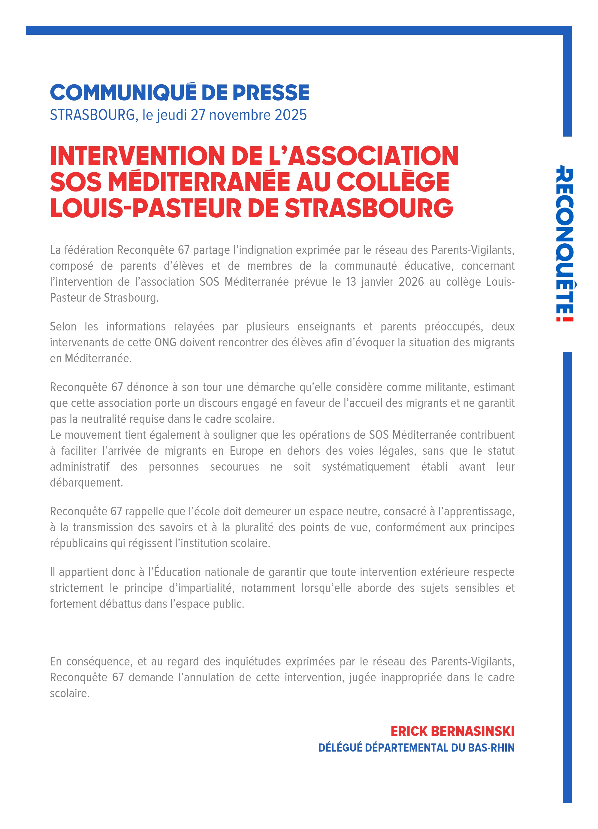 La fédération Reconquête 67 partage l’indignation exprimée par le réseau des Parents-Vigilants, composé de parents d’élèves et de membres de la communauté éducative, concernant l’intervention de l’association SOS Méditerranée prévue le 13 janvier 2026 au collège Louis-Pasteur de Strasbourg.